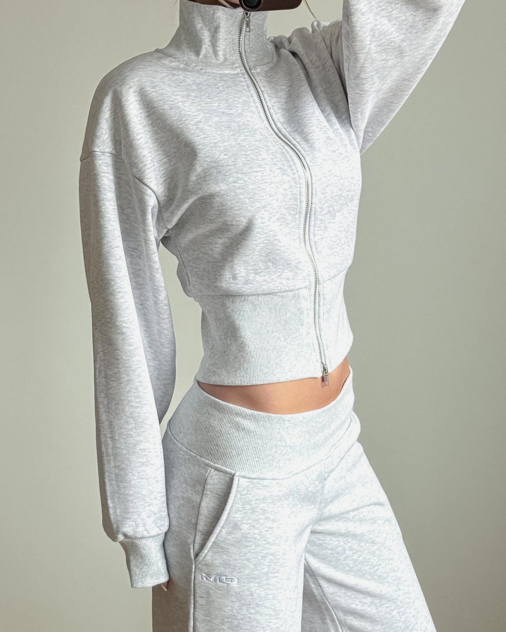 Gabrielle zip-up sweater crafted from a thick, comfortable material and designed as the perfect upgrade to your cozy wardrobe. This piece features a high ribbed neckline, a flattering silhouette, and a wide ribbed waistband for a structured yet relaxed fit. Subtle OM embroidery at the back of the neck. This Sweater is giving off a hint of 90s nostalgia. Finished with a smooth double zipper, you can wear it fully zipped, half-open, or styled however you prefer. Pair it with our matching pants for the full look.